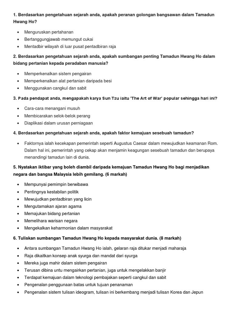 TAMADUN HWANG HO Ciri Sumbangan Buku teks ms 29 - 32 Skima. Oct 07 2019 Soalan kbat Sejarah PT3 1. May 07 2014 TAJUK RAMALAN SEJARAH 2 SPM 2014 TEMA 7 Bab 1 Tingkatan 4 TAMADUN HWANG HO SOALAN STRUKTUR Modul 1.