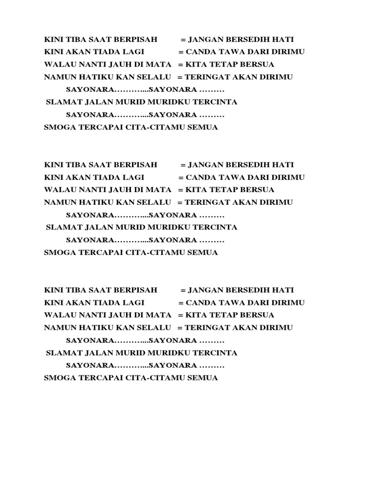 Dec 02 2012 Lagu Perpisahan Sekolah. Kini tiba saatnya kita untuk berpisah. TELAH TIBA SAAT BERPISAHTelah tiba saat berpisahPisah hanya di lahirnyaDi hati kita tetaplah satuKarena janji kita satu Dalam hati kita tetap inga.