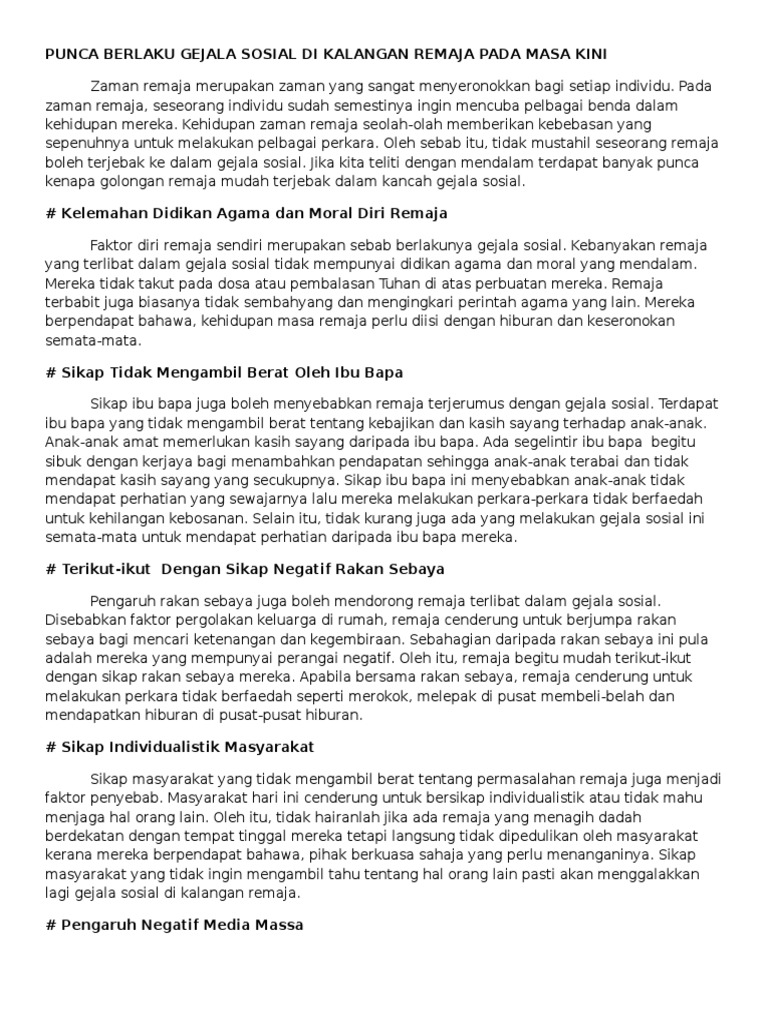 Masalah gejala sosial di dalam kalangan remaja pada hari ini akan memberikan kesan dan impak yang begitu besar dalam diri individu masyarakat dan Negara. Aug 20 2017 Masalah gejala sosial di dalam kalangan remaja pada hari ini akan memberikan kesan dan impak yang begitu besar dalam diri individu masyarakat dan Negara. Konklusinya media massa adalah antara penyumbang utama berlakunya gejala sosial mendatangkan keburukan dan membawa kesan negatif kepada remaja pada hari ini.