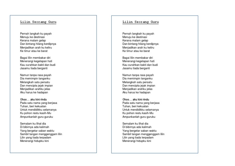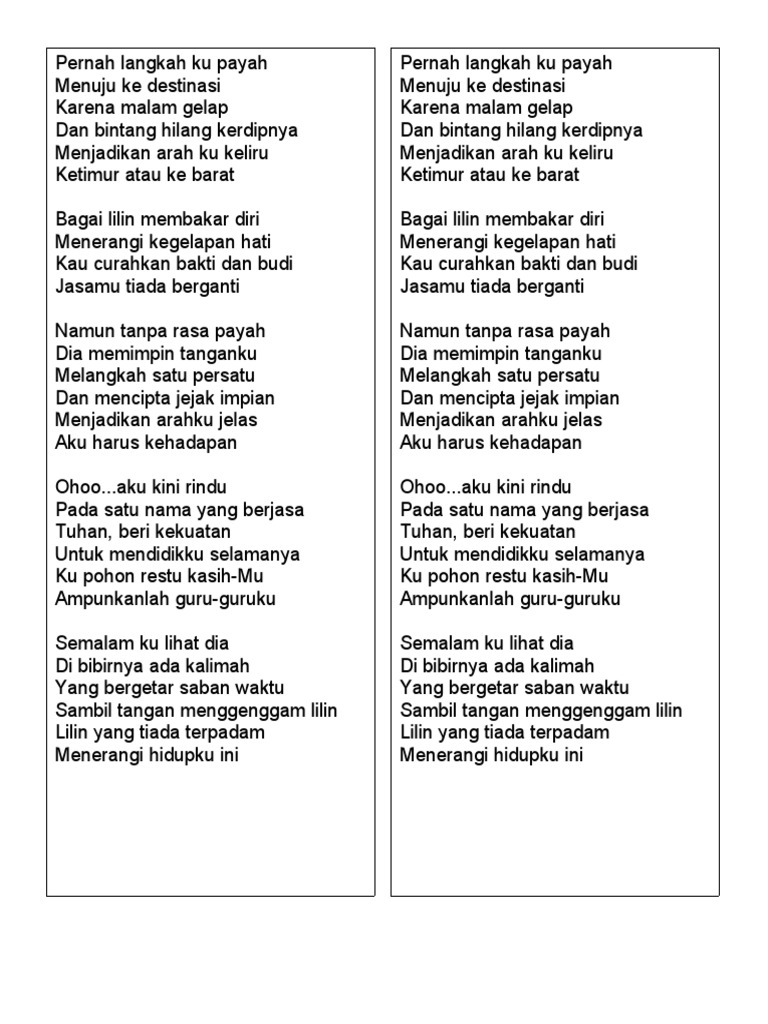 Ohoo aku kini rindu Pada satu nama yang berjasa Tuhan beri kekuatan Untuk mendidikku selamanya Ku pohon restu kasih-Mu Ampunkanlah guru-guruku. May 16 2010 Aku harus ke hadapan Ohoo aku kini rindu Pada satu nama yang berjasa Tuhan beri kekuatan Untuk mendidikku selamanya Ku pohon restu kasih-Mu Ampunkanlah guru-guruku Semalam ku lihat dia Di bibirnya ada kalimah Yang bergetar saban waktu Sambil tangan menggenggam lilin Lilin yang tiada terpadam Menerangi hidupku kini. Beri kekuatan Untuk mendidikku selamanya Ku pohon restu kasihmu Ampunkanlah guru-guruku Semalam ku lihat dia Di bibirnya ada kalimah Yang bergetar saban waktu Sambil tangan menggenggam lilin Lilin yang tiada terpadam Menerangi hidupku kini Sumbangan Nazreeni.