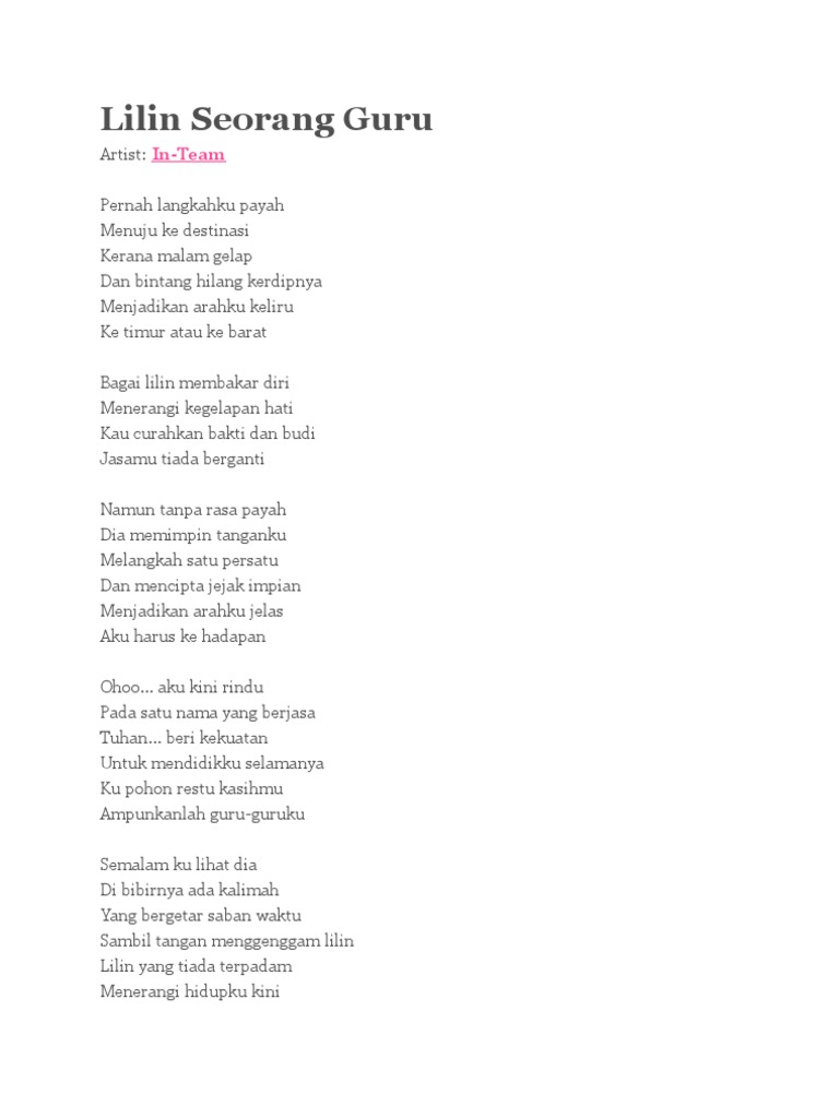 May 18 2009 Aku harus ke hadapan Ohoo aku kini rindu Pada satu nama yang berjasa Tuhan beri kekuatan Untuk mendidikku selamanya Ku pohon restu kasih-Mu Ampunkanlah guru-guruku Semalam ku lihat dia Di bibirnya ada kalimah Yang bergetar saban waktu Sambil tangan menggenggam lilin Lilin yang tiada terpadam Menerangi hidupku kini. Ohoo aku kini rindu. Jul 21 2017 Lyrics for Lilin Seorang Guru by Inteam.
