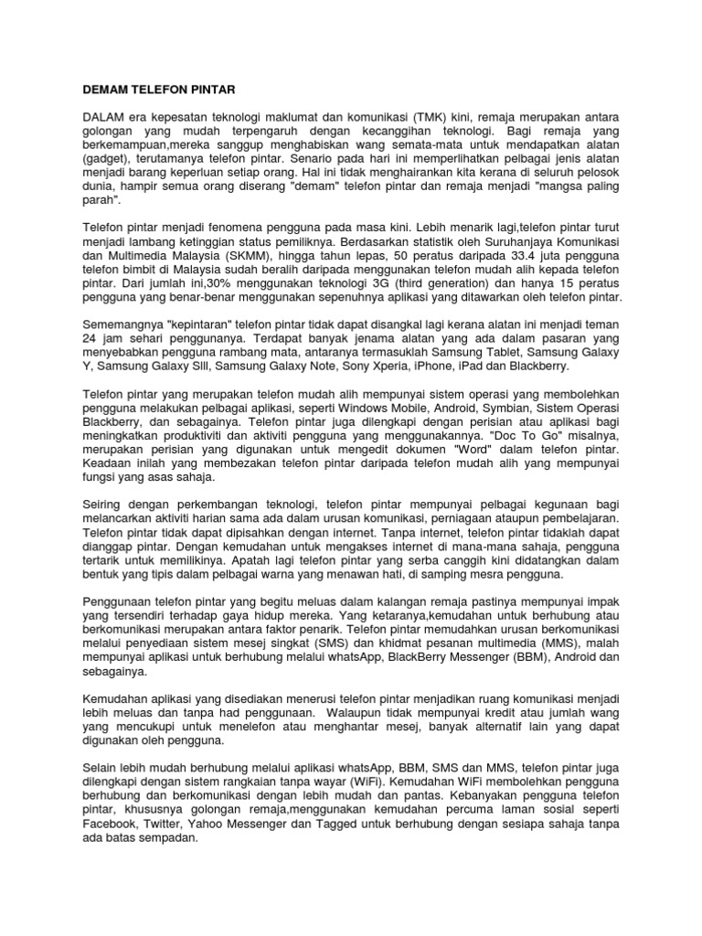 Telefon bimbit pintar ini digunakan sebagai alat untuk berkomunikasi dan alat pencarian matlumat melalui internet. Kertas kerja ini membincangkan tentang perkembangan Pembelajaran M-Learning di Malaysia faedah serta masalah yang dihadapi dalam mengintegrasikan alatan mudah alih dengan senario pendidikan. Jun 25 2016 Beliau berkata tema Kempen Keselamatan Jalan Raya Balik Kampung Yamaha ke-18 iaitu Fokus Di Jalan Bukan Di Tangan adalah bertepatan dengan senario semasa kerana kajian yang dijalankan oleh Miros mendapati 80 peratus kemalangan berpunca daripada kecuaian manusia termasuk penggunaan telefon bimbit.