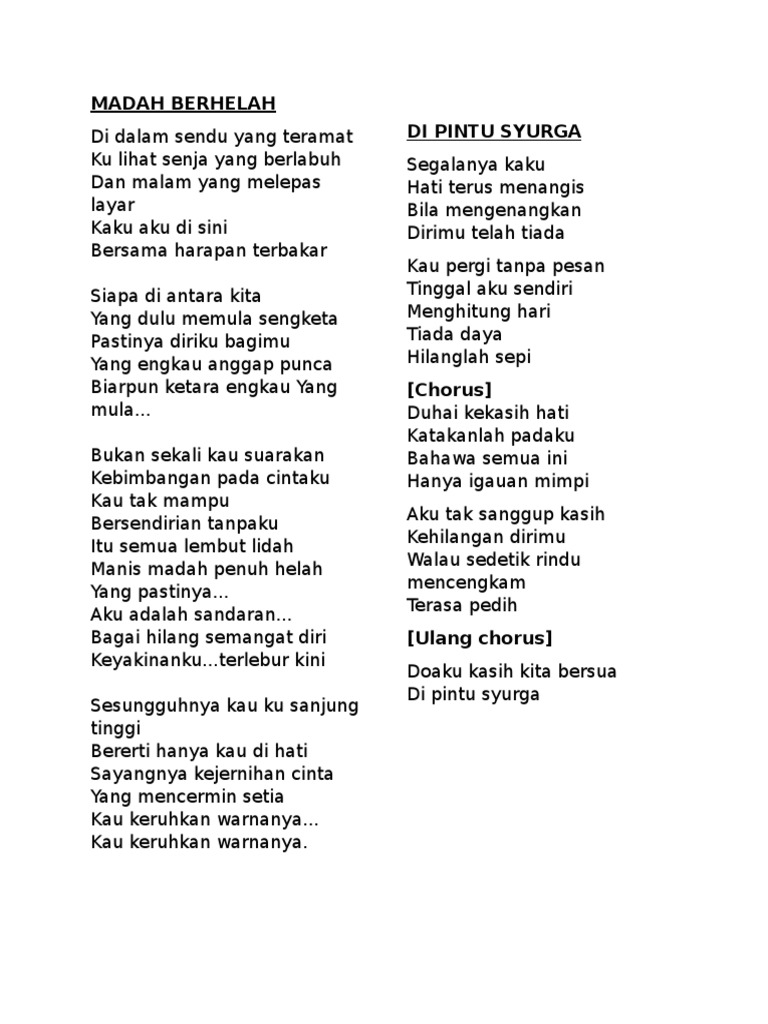 Agar hidup takkan sendiri lagi Doa restu dari yang tercinta Fahamilah Cinta mulia Sumbangan Pheaze. Kan kuingatdi dalam hatiku Betapa indah semalam di cianjur Janji kasih yang tlah kau ucapkan Penuh kenanganyang takkan terlupakan Tapi. Sumber terlengkap lirik lagu rohani Kristen lirik lagu rohani.