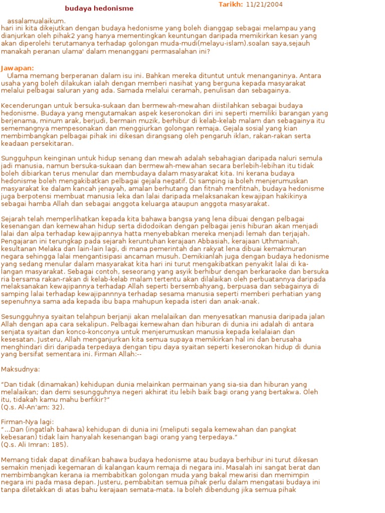 Mar 19 2015 HEDONISME Kamus Dewan mendefinisikan hedonisme sebagai pegangan atau pandangan hidup yang mementingkan kesenangan hidup. Apa yang penting kita bicarkan tentang effectnya hedonisme ini dikalangan masyarakat Islam di masa kini. 51 Kewujudan Internet Internet dicipta pada 1980-an CITATION Eva13 l 1033.