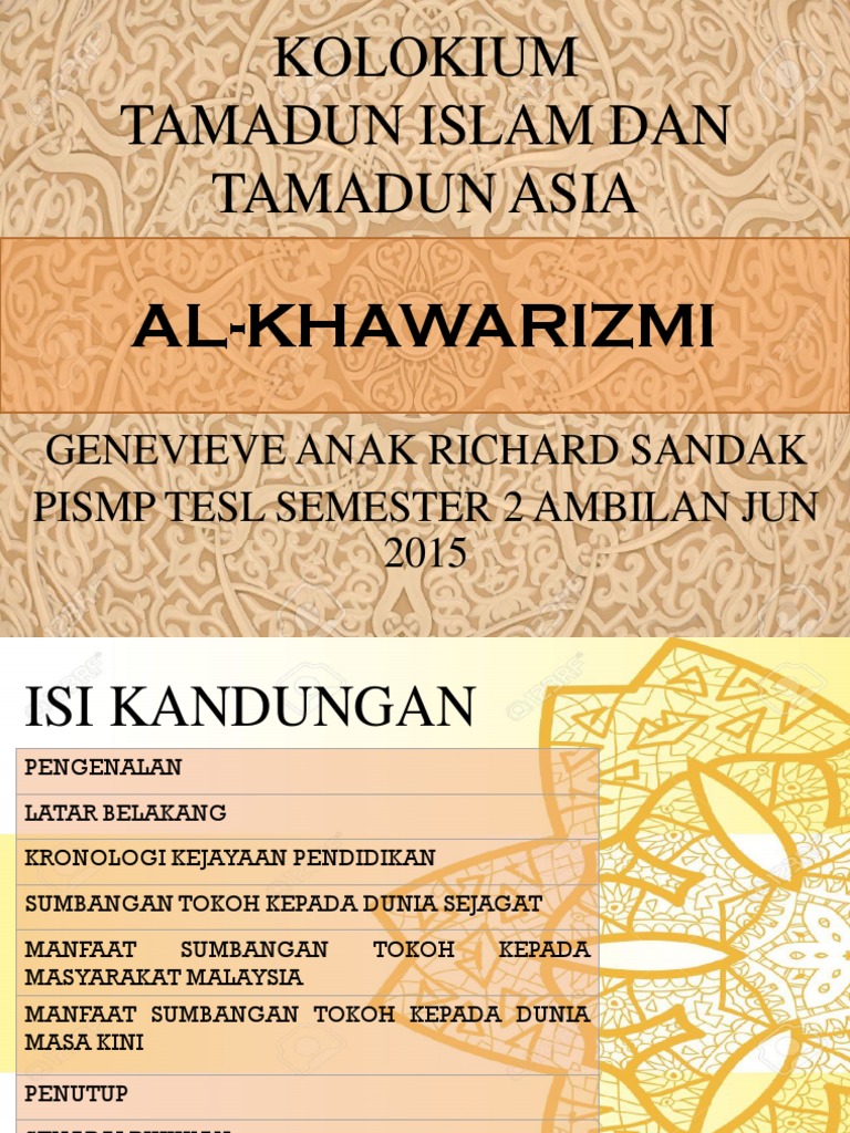 May 21 2019 Tokoh yang bernama lengkap Muhammad bin Musa al-Khwarizmi merupakan intelektual muslim yang banyak menyumbangkan karyanya dalam bidang matematika geografi musik dan sejarah. Dalam bidang Geografi beliau pernah menghitung Garisan Khatulistiwa bumi pada tahun 830 Masihi dan mendapati ukurannya ialah 40248 km berbanding dengan penemuan masa sekarang 40070 km. NAMA SITI NURUL ATIKA BINTI ABU BAKAR NOPELAJAR 2017882604 PROGRAM DIPLOMA PENGURUSAN PERNIAGAAN KOD PROGRAM CTU151 Pensyarah SOFHAN JAMIELA BINTI ROSLI Institut Pendidikan NEO Universiti.
